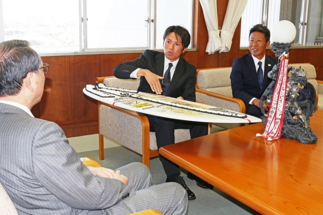 市長を表敬訪問した全日本スキムボード選手権大会優勝の壁下さん(中央)=5日、市役所市長応接室 (2015/10/06)