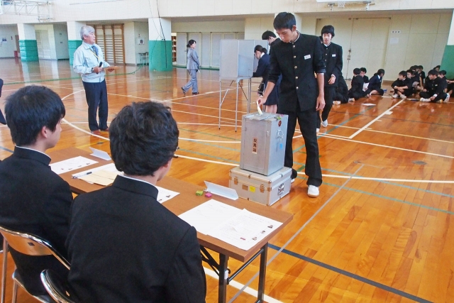 本物の投票箱を使い、模擬選挙で1票を投じる生徒=6日、西山中 (2015/10/07)