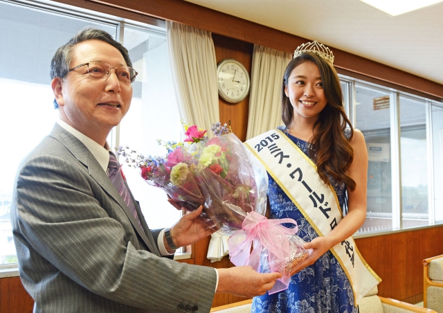 会田市長から花束を贈られる「ミス・ワールド」日本代表の中川知香さん(右)=7日午後、市役所市長応接室 (2015/10/08)