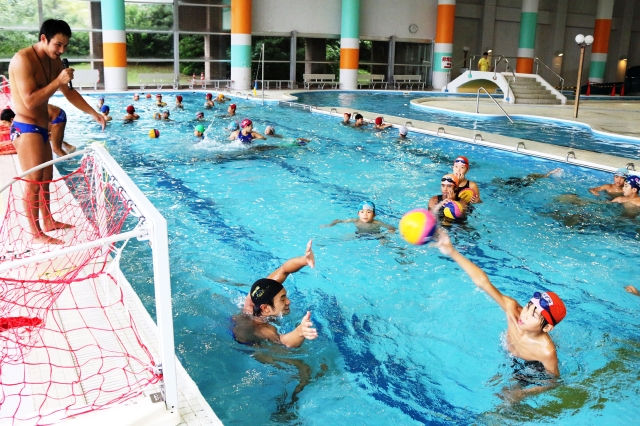 水球ブルボンKZの選手らが指導した水泳水球教室=13日、柏崎アクアパーク (2015/09/16)