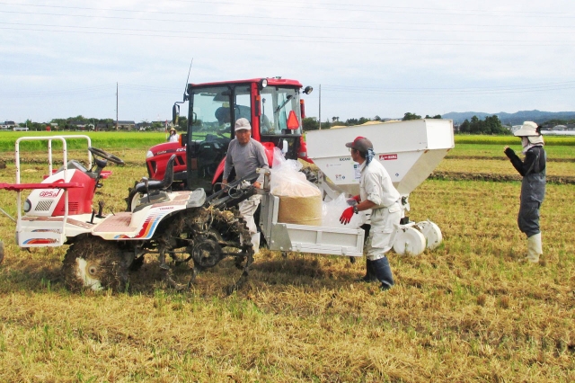 稲刈り後の水田で野菜を育てるため、特殊な機械でもみ殻の排水路を作る作業 (2015/09/17)