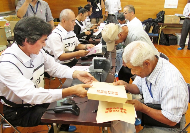 安定ヨウ素剤を受け取る住民たち=17日、市内宮川の高浜コミュニティセンター (2015/09/18)