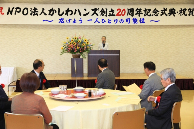 かしわハンズの創立20周年記念式典。次の10年へ向けて一層の努力を誓った=18日、産文会館大ホール (2015/09/19)