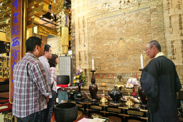 極楽寺本堂に展示されている単瑞上人作の「観無量寿経曼陀羅」=市内若葉町 (2015/09/21)