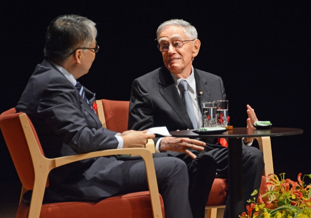 対談を行うドナルド・キーンさん(右)=21日、アルフォーレ・大ホール (2015/09/24)