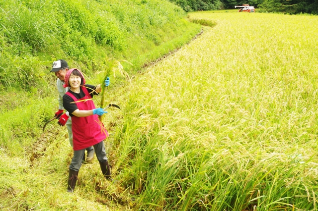 市内高柳町石黒の水田で酒米「五百万石」を収穫する石塚社長 (2015/09/25)