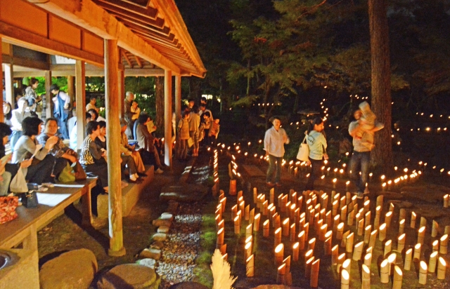 ろうそくの明かりがともされた竹とうろうによるイベント「竹あかり」=26日夜、飯塚邸 (2015/09/28)