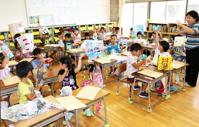 夏休み明け最初の授業で、担任教諭に宿題の自由研究を見せる児童たち=26日、田尻小 (2015/08/26)