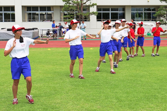 体育祭で披露する刈羽甚句の全体練習=26日、刈羽中グラウンド (2015/08/27)