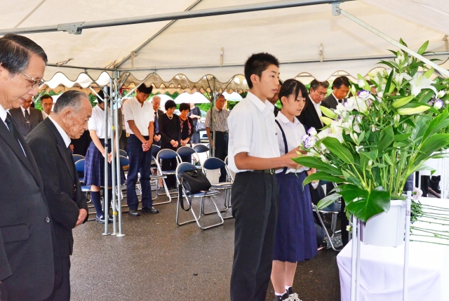 旧満州柏崎村開拓団の慰霊式典で「平和への誓い」を述べる中学生代表の2人=29日午前、市内赤坂山公園の「満州柏崎村の塔」の前 (2015/08/29)