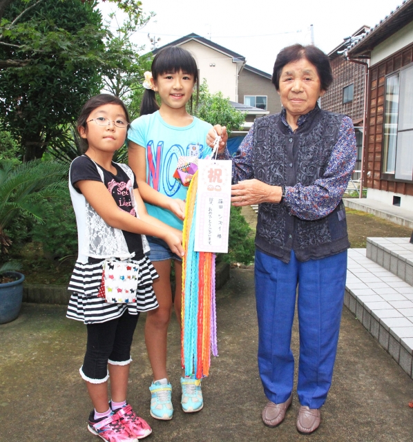 長寿と健康に願いを込め、米寿のお年寄りに千羽鶴を贈る中通小の児童 (2015/09/03)