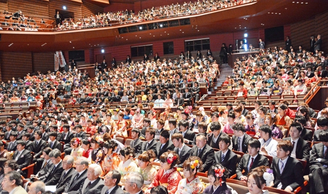 アルフォーレで3年目となった新成人フェスティバル。会場に若さと笑顔があふれた=3日、大ホール