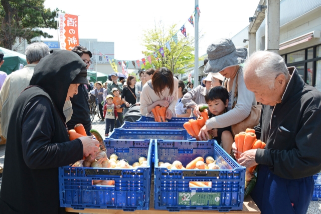 今年第1回の「ほんちょうマルシェ」。野菜の詰め放題などで人気を集めた=2日、フォンジェストリート棟