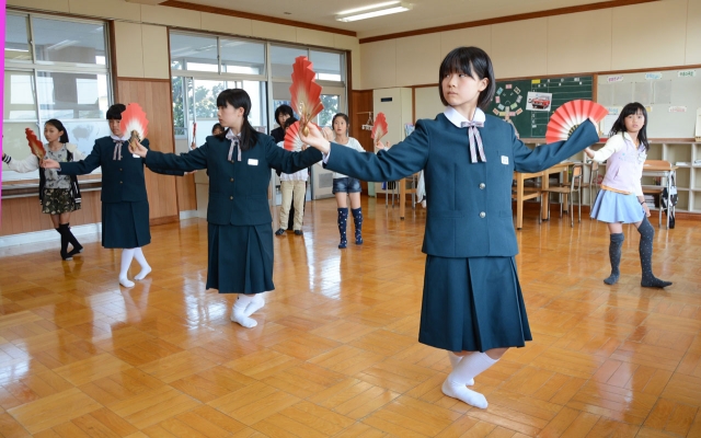 綾子舞の今年の練習を開始した南中、新道小の児童生徒=7日、南中