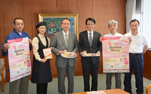 会田市長に「菓子和咲スイーツブック」事業を報告した菓子工業組合柏崎支部=市役所