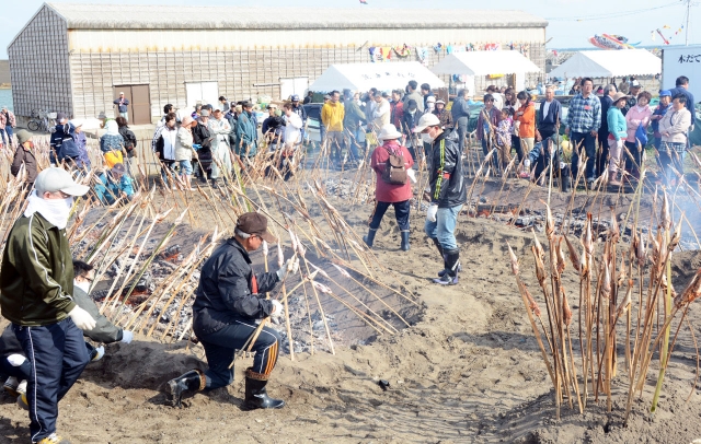 荒浜地区恒例の「イワシまつり」。今年で20回目を数える砂浜には大漁旗がなびき、浜焼きの香ばしさが立ち込めた=10日、荒浜漁港
