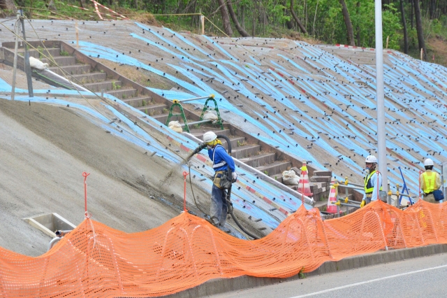 モルタル吹き付けが行われている防火帯設置工事。道路沿いの場所は路面も防火帯の一部となる=柏崎刈羽原発構内