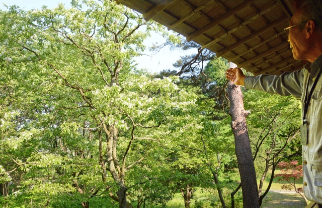 雪のように真っ白い花をつけた「なんじゃもんじゃ」の木。今週末ごろまで見頃だ=13日午後、市内新道の飯塚邸