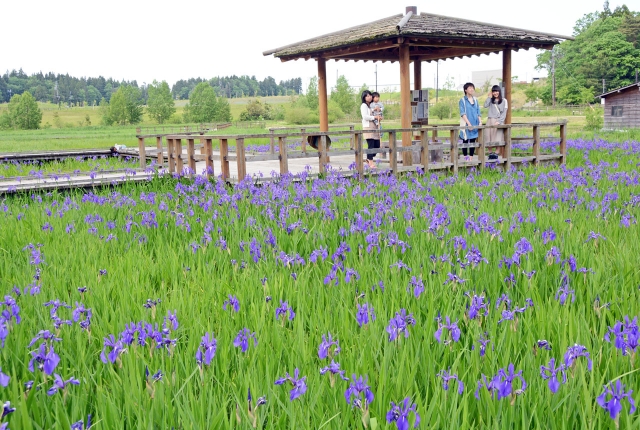 池一面を彩るカキツバタの紫色の花。今がちょうど見頃だ=14日午後、市内軽井川の柏崎・夢の森公園 (2015/05/15)