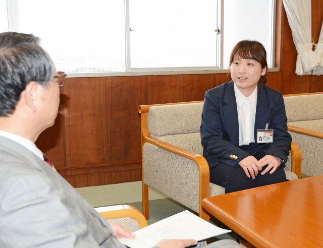 会田市長から励ましを受ける根立早織さん(右)=18日、市役所市長応接室 (2015/03/23)