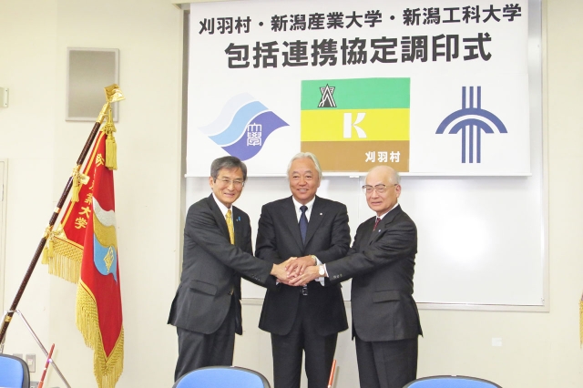 地元2大学と包括連携協定を結んだ刈羽村の調印式=25日、刈羽村役場 (2015/03/25)