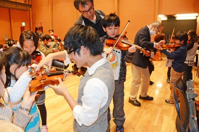 楽しく真剣に取り組んだ「子どものためのバイオリン・チェロはじめて体験会」=29日、アルフォーレ・マルチホール (2015/03/31)
