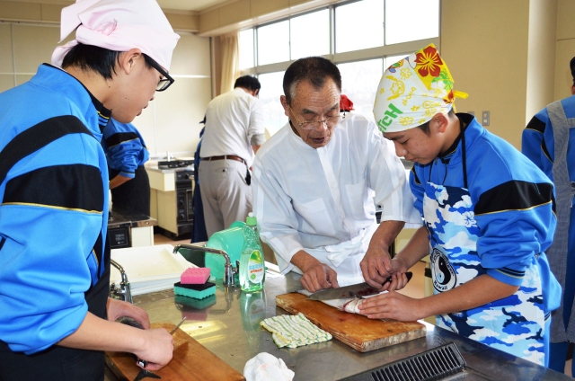 魚の三枚おろしに挑戦する生徒たち=18日、鏡が沖中 (2015/02/26)