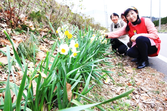 春の訪れとともに、日ごとに花の数が増えている大崎スイセン=市内西山町、大田コミセン脇 (2015/02/27)
