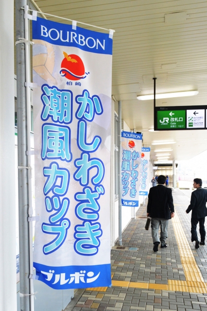 柏崎駅周辺などに設置されている潮風カップをPRするのぼり旗 (2015/02/28)