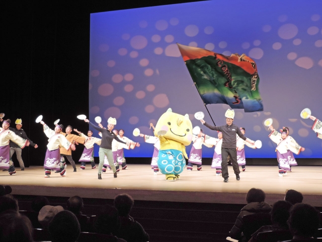賛助出演の「よさこいCOMECOMEくらぶ」とえちゴンを中心に披露された「新民謡」=アルフォーレ・大ホール (2015/03/02)