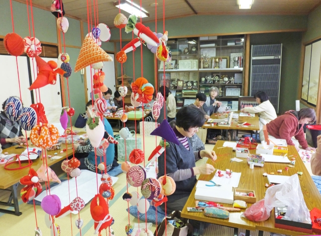 思い出の着物地などで、つるしびなを作る手芸講座の受講者=市内半田コミセン (2015/03/05)