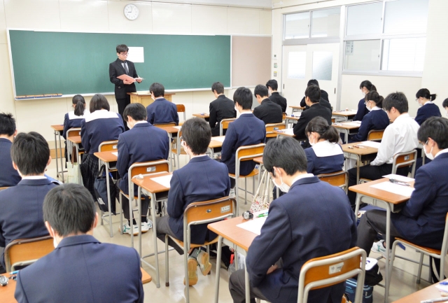 高校入試で受験の注意を聞いた後、問題用紙の配布を待つ受験生=柏高 (2015/03/09)