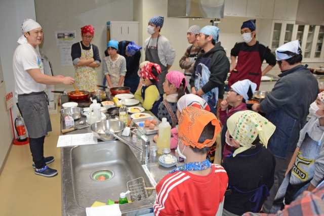 子どもと一緒にオムライス作りに挑戦した柏崎オヤジ倶楽部の参加者=11日、市民プラザ (2015/02/16)