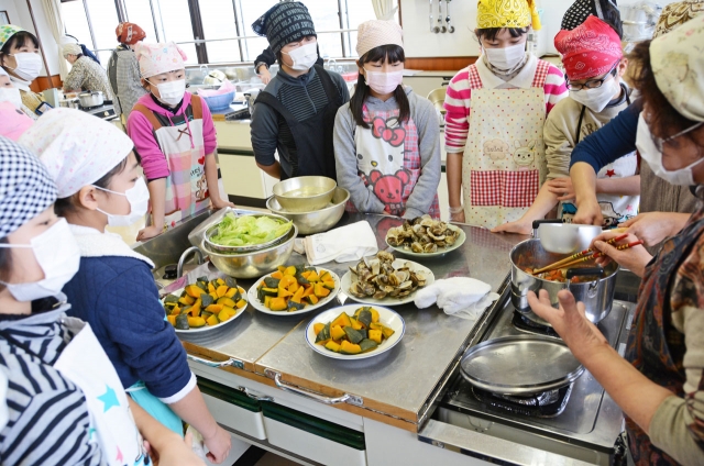地域の人から「陣屋弁当」作りを教わる大洲小5年生=18日、同校 (2015/02/20)