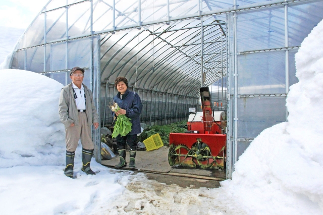 3メートル近い積雪の中で、ビニールハウスの野菜作りに励む大橋さん夫婦=市内高柳町 (2015/02/21)