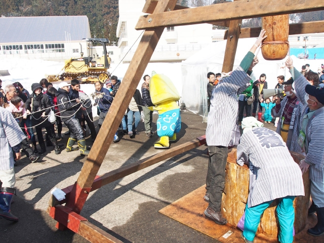 高柳雪まつりで大勢が力を合わせて綱を引いた巨大餅つき (2015/02/23)