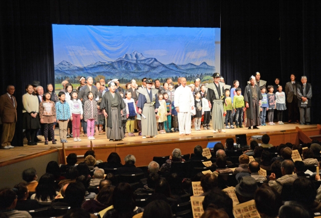 西中通地区の「ふしなり座」公演。フィナーレで同地区のテーマソングを歌う出演者=21日、産文会館文化ホール (2015/02/24)