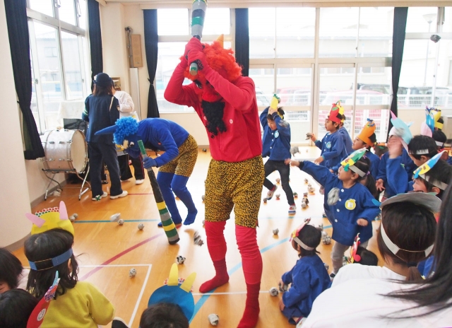 交通ルールを守らない悪い鬼に豆をまく園児ら=3日、枇杷島保育園 (2015/02/03)