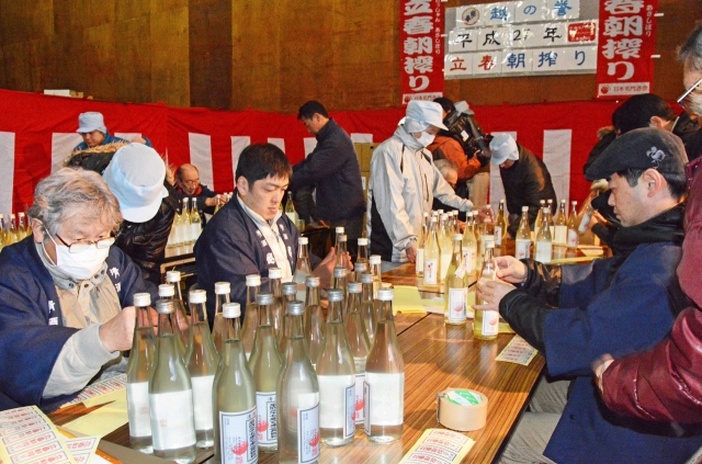 立春の酒の出荷で、新酒の瓶にラベルを貼る作業をする酒店店主ら=4日早朝、原酒造 (2015/02/04)