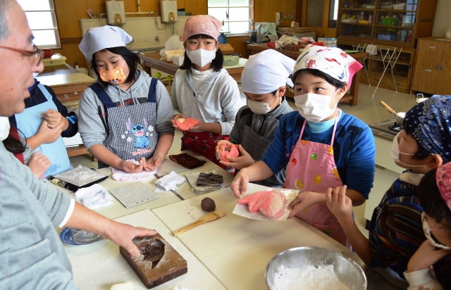 縁起物の菓子「跳ね鯛」作りに挑戦した児童=4日、米山小 (2015/02/06)