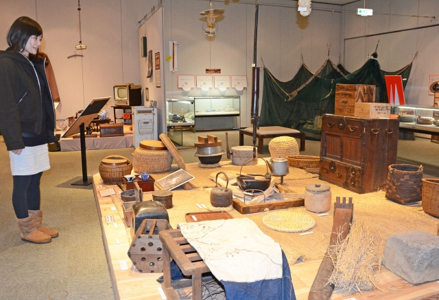 開催中の収蔵資料展「むかしのくらしと道具―衣食住を支えたモノたち」=市立博物館 (2015/02/09)