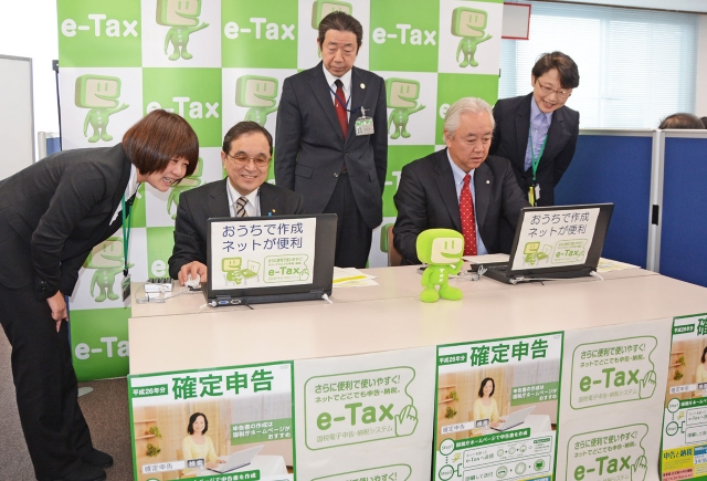 電子申告システムで入力する山田副市長(左)と品田村長、後列中央は古田土署長=12日午前、柏崎税務署 (2015/02/12)