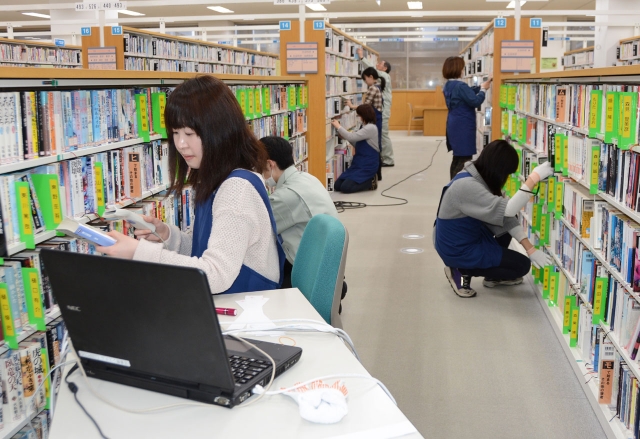 特別整理休館中のソフィアセンター。端末機器を使って蔵書を点検する職員たち=12日 (2015/02/13)