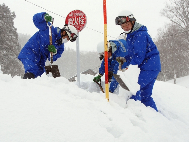 2メートルの雪に埋もれた消火栓を掘り出す消防署員=13日、市内高柳町石黒 (2015/02/14)