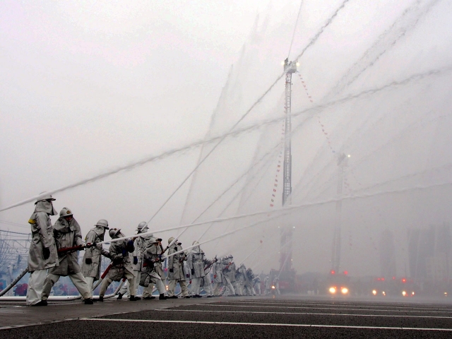 サイレンを合図に、消防署員と消防団員が一斉放水した市消防出初め式=11日、市内日石町 (2015/01/13)