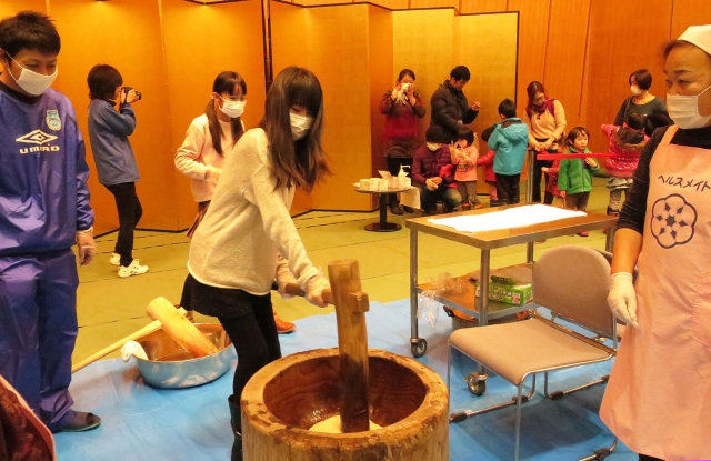 威勢のいい声が飛び交った新年餅つき大会=10日、刈羽村ラピカ文化ホール (2015/01/14)