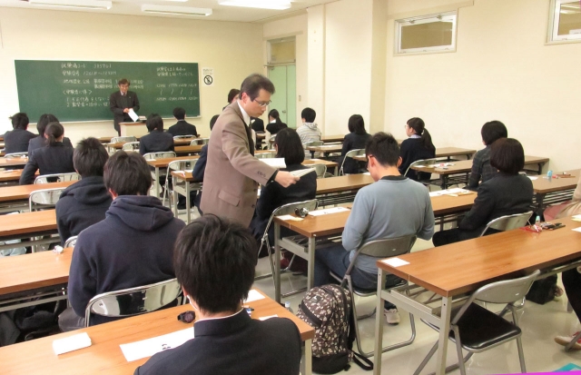 1時間目の「地理歴史」「公民」の2科目選択の受験生に、袋詰めされた問題冊子を配る試験官=17日午前9時過ぎ、新潟産大 (2015/01/17)
