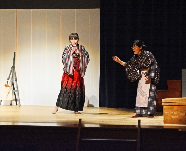 今年の柏崎演劇フェスティバルの幕開けとなった劇団のあの舞台=17日、産文会館文化ホール (2015/01/21)