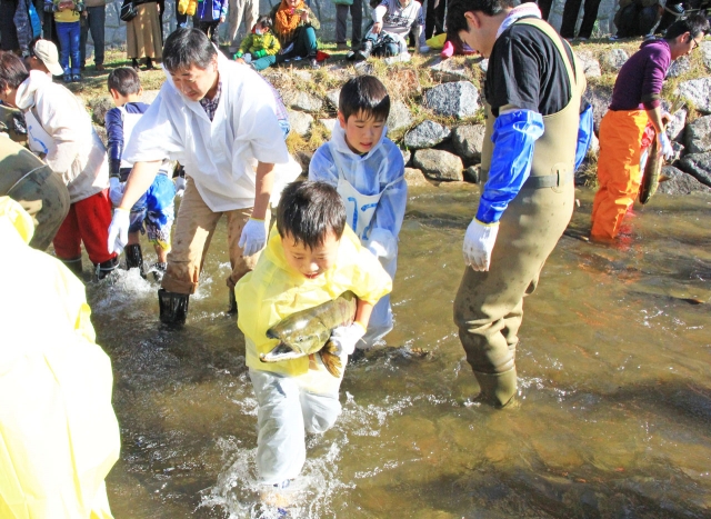 大きなサケのつかみ取りに挑戦した子どもたち=22日午前、柏崎さけのふるさと公園 (2014/11/22)