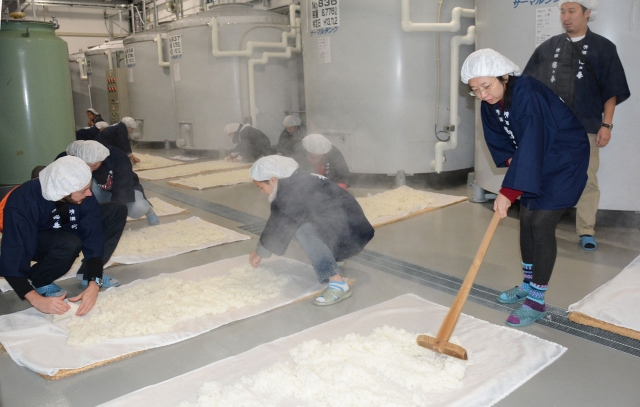 大吟醸の仕込みを前に、昔ながらの手作業で酒米を冷ます作業をする参加者=23日、市内新橋の原酒造 (2014/11/25)